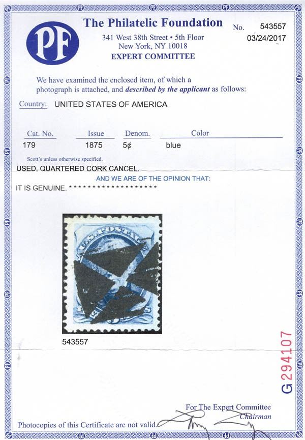 1875, 5¢ Taylor, blue, C.B.N.C. printing. Scott 179. Well centered within large margins, XF and choice, with 2017 P.F. certificate