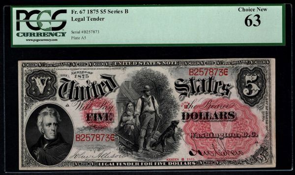 One 1875 $5 Woodchopper Legal Tender Note PCGS 63.
