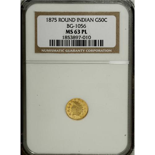 <B>1875 50C Indian Round 50 Cents, BG-1056, High R.4, MS63 Prooflike NGC.</B></I> Select and boldly struck with slight planchet roughness. The yellow-orange fields are moderately mirrored despite a degree of haze. Census: 1 in 63 Prooflike, 5 finer (12/06).<BR><I>From The Twin Hollows Collection, Part Two.</B></I><BR><BR><b>Shipping:</b> Coins & Currency (<a target="_blank" href="http://www.heritageauctions.com/common/shipping.php">view shipping information</a>)