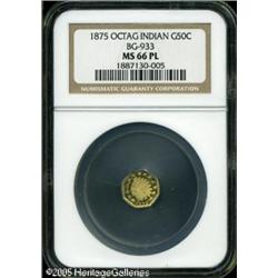<B>1875 50C Indian Octagonal 50 Cents, BG-933, R.5, MS66 Prooflike NGC.</B></I> A frosty, prooflike example, with an abnormally sharp strike and mark-free surfaces. The glistening fields and devices are yellow-gold and mint-green, and show numerous faint striations (as struck) over the center of the reverse. Lot:9811