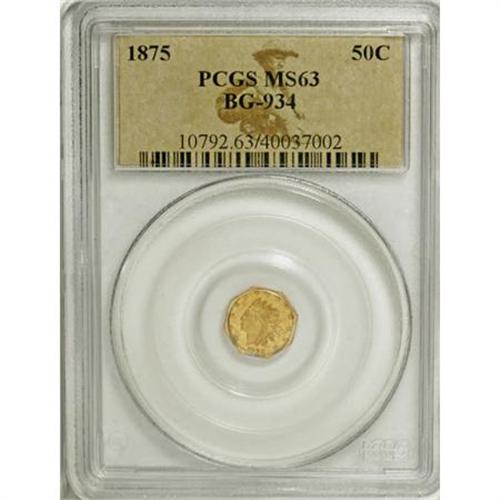 <B>1875 50C Indian Octagonal 50 Cents, BG-934, R.4, MS63 PCGS.</B></I> PCGS Population (15/11). NGC Census: (6/5). (#10792)<BR><BR><b>Shipping:</b> Coins & Currency (<a target="_blank" href="http://www.heritageauctions.com/common/shipping.php">view shipping information</a>)