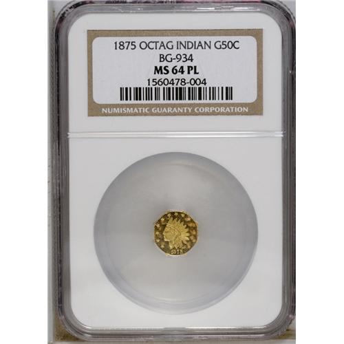 <B>1875 50C Indian Octagonal 50 Cents, BG-934, R.4, MS64 Prooflike NGC.</B></I> Highly reflective overall, though the bright yellow-gold fields have a measure of haze on each side. Solidly struck and appealing. Census: 4 in 64 Prooflike, 1 finer (12/06).<BR><BR><b>Shipping:</b> Coins & Currency (<a target="_blank" href="http://www.heritageauctions.com/common/shipping.php">view shipping information</a>)