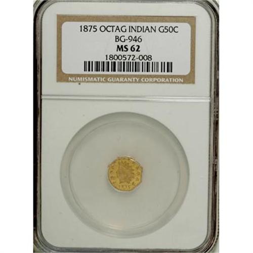 <B>1875 50C Indian Octagonal 50 Cents, BG-946, R.4, MS62 NGC.</B></I> NGC Census: (2/8). PCGS Population (20/39). (#10804)<BR><BR><b>Shipping:</b> Coins & Currency (<a target="_blank" href="http://www.heritageauctions.com/common/shipping.php">view shipping information</a>)