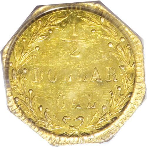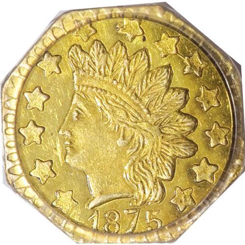 <B>1875 50C Indian Octagonal 50 Cents, BG-947, High R.7, MS62 PCGS.</B></I> BG-947 is extremely rare. Prior to the present lot, the last appearance of BG-947 in a Heritage Signature auction was in 1996. A crisply struck green-gold representative that has glimpses of lacquer in protected areas.<BR><I>From The Diamond K Collection of California Fractional Gold.</B></I><BR><BR><b>Shipping:</b> Coins & Currency (<a target="_blank" href="http://www.heritageauctions.com/common/shipping.php">view shipping information</a>)