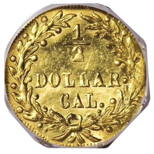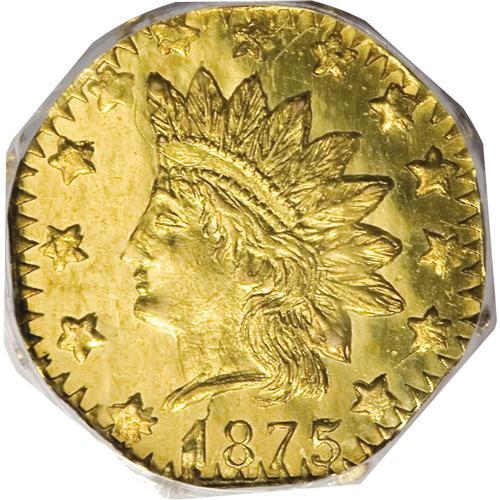 <B>1875 50C Indian Octagonal 50 Cents, BG-948, High R.5, MS66 Deep Mirror Prooflike NGC.</B></I> A lemon-tinted Gem with exceptional field reflectivity. A trio of mint-made obverse lintmarks are found near 12 o'clock. The present lot is the finest certified BG-948 octagonal half. NGC has certified only one other piece, as MS63. The two highest graded PCGS examples are MS65.<BR><I>From The Diamond K Collection of California Fractional Gold.</B></I><BR><BR><b>Shipping:</b> Coins & Currency (<a target="_blank" href="http://www.heritageauctions.com/common/shipping.php">view shipping information</a>)