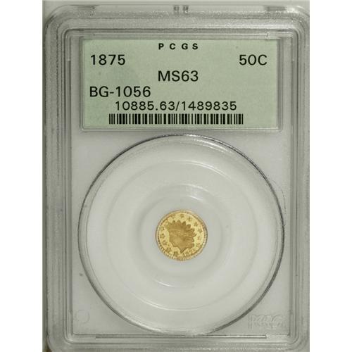 <B>1875 50C Indian Round 50 Cents, BG-1056, High R.4, MS63 PCGS.</B></I> Striking contrast is noticed between the motifs and fields, especially on the obverse. Well struck with pleasing all-around yellow-gold color.<BR><BR><b>Shipping:</b> Coins & Currency (<a target="_blank" href="http://www.heritageauctions.com/common/shipping.php">view shipping information</a>)
