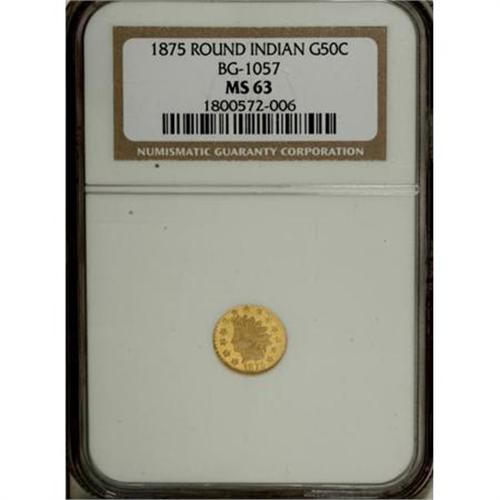 <B>1875 50C Indian Round 50 Cents, BG-1057, High R.5, MS63 NGC.</B></I> NGC Census: (3/0). PCGS Population (7/10). (#10886)<BR><BR><b>Shipping:</b> Coins & Currency (<a target="_blank" href="http://www.heritageauctions.com/common/shipping.php">view shipping information</a>)