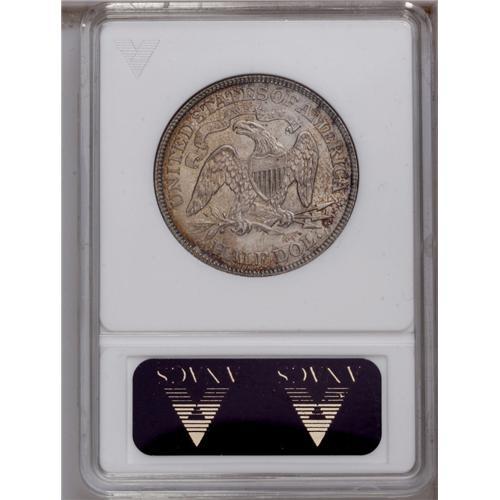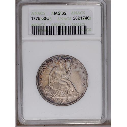 <B>1875<50C> MS62 ANACS.</B></I> Dappled autumn-brown and ivory-gray toning visits this satiny Seated type coin. Well struck save for the eagle's left (facing) claw. Minor pitting above the 5 in the date, but charming overall.
