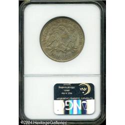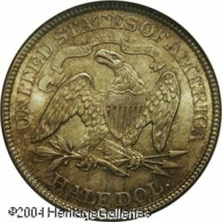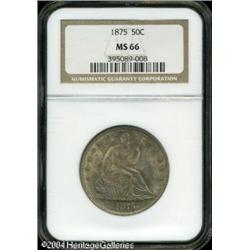 1875 50C MS66 NGC. Pale mauve and gray-green patin <B>1875 50C MS66 NGC.</B></I> Pale mauve and gray-green patina lightly blankets the surfaces of this remarkable premium Gem. Well struck throughout, there are no obvious or distracting blemishes on either side, just a few small nicks that do little to affect the eye appeal of the piece. Vibrant luster is only partially obscured by the rich toning, as the coin presents a lovely satiny radiance. Needless to say, very few of the more than six million examples of this issue that were produced by the U.S. mint have survived in such a lofty state of preservation. In fact, only 18 1875 Half Dollars have earned the grade of MS66, at NGC and PCGS combined, with only one graded higher (11/04). <BR><BR><B>Important notice:</B> Heritage usually auctions material at the rate of 200-250 lots per hour. On some occasions eBay Live bid software or the Internet may not be able to keep up with the pace of the auction. We recommend placing a realistic absentee bid now as insurance to avoid disappointment. Occasionally the auctioneer may eliminate or reject an eBay Live bid, and the auctioneer may also reopen a lot after the close of the eBay live bidding (usually because we missed an audience bid), and may reject your bid even if it shows you as the winning bidder. By bidding via eBay Live, you agree that Heritage may award the lot to another bidder at its sole discretion under the circumstances described above or any other reasonable circumstances. Since eBay bids are not shown to us until we open the lot on the floor, we treat those bids just like floor bids. In most cases the floor responds before the eBay bid is presented to us, due to Internet lag time, so for consistency we have made it a policy that floor bids are always considered first over tie eBay live bids. Also please note that all Heritage lots purchased through eBay Live carry a 20% Buyer's Premium. Please make sure you read the Terms and Conditions before you bid. This lot is being auctioned in conjunction with a live floor auction by Heritage Galleries & Auctioneers. All final auction and invoice information will be supplied by Heritage Galleries & Auctioneers, and all other information should be considered preliminary. Lot:6101