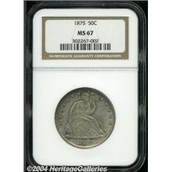 <B>1875<50C> MS67 NGC.</B></I> Golden-brown and apple-green patina outlines the margins and devices, while the fields and the Seated Liberty possess rich dove-gray color. Luster rolls unencumbered across the well preserved surfaces. The reverse is virtually immaculate. Arrows were removed on the Half Dollar in 1875, but the slightly higher weight standard technically constitutes a different type than the 1866 to 1873 No Arrows issues. The single finest NGC-certified business strike 1875 Seated Half. PCGS has not graded any pieces above MS66. <BR><BR><B>Important notice:</B> Heritage usually auctions material at the rate of 200-250 lots per hour. On some occasions eBay Live bid software or the Internet may not be able to keep up with the pace of the auction. We recommend placing a realistic absentee bid now as insurance to avoid disappointment. Occasionally the auctioneer may eliminate or reject an eBay Live bid, and the auctioneer may also reopen a lot after the close of the eBay live bidding (usually because we missed an audience bid), and may reject your bid even if it shows you as the winning bidder. By bidding via eBay Live, you agree that Heritage may award the lot to another bidder at its sole discretion under the circumstances described above or any other reasonable circumstances. Since eBay bids are not shown to us until we open the lot on the floor, we treat those bids just like floor bids. In most cases the floor responds before the eBay bid is presented to us, due to Internet lag time, so for consistency we have made it a policy that floor bids are always considered first over tie eBay live bids. Also please note that all Heritage lots purchased through eBay Live carry a 20% Buyer's Premium. Please make sure you read the Terms and Conditions before you bid. </span></font></tr></table></td></tr></table>