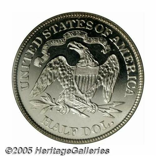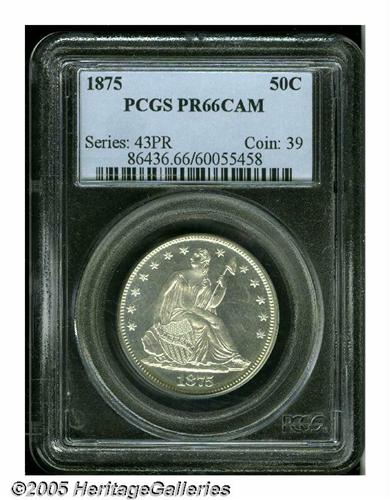 <B>1875<50C> PR66 Cameo PCGS.</B></I> Brilliant throughout and intensely lustrous, the fields set up a flashy proof sheen with the frosted devices set against them. Pinpoint striking details and virtually defect-free. Population: 1 in 66, 0 finer (5/05).