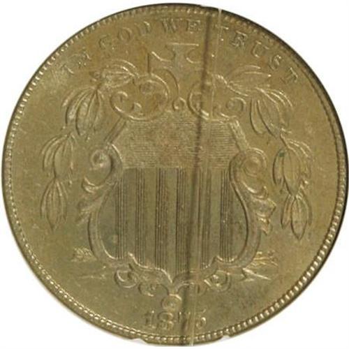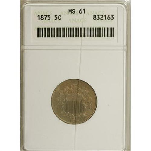 <B>1875 5C MS61 ANACS.</B></I> MS61. NGC Census: (3/106). PCGS Population (2/127). Mintage: 2,097,000. Numismedia Wsl. Price for NGC/PCGS coin in MS61: $200. (#3804)<BR><BR><B>Coin Engraver:</B> James B. Longacre<BR><BR><b>Shipping:</b> Coins & Currency (<a target="_blank" href="http://www.heritageauctions.com/common/shipping.php">view shipping information</a>)