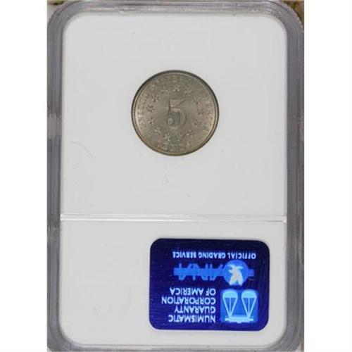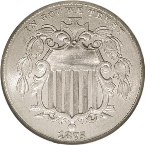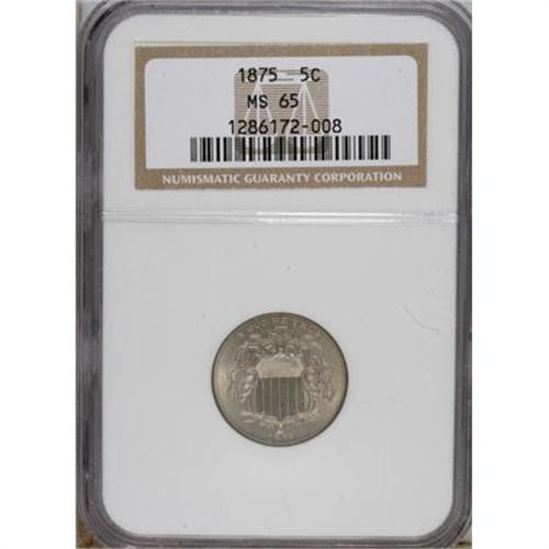 <B>1875 5C MS65 NGC.</B></I> David Bowers (2006), writing about the 1875 nickel, indicates that: "Quality is elusive for this date" because of poor planchet preparation. The Gem offered here deviates from this profile. Its light gray surfaces yield soft luster and sharply impressed design features. A couple of light obverse flecks are noted for complete accuracy. Census: 24 in 65, 5 finer (6/07).<BR><BR><b>Shipping:</b> Coins & Currency (<a target="_blank" href="http://www.heritageauctions.com/common/shipping.php">view shipping information</a>)