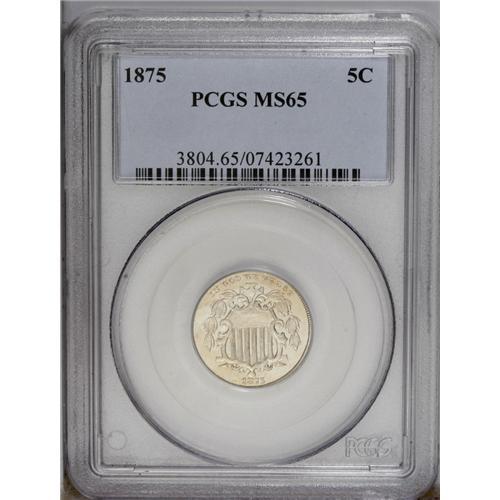<B>1875<5C> MS65 PCGS.</B></I> Sharply struck design elements complement pleasing light gold surfaces. Both sides are well preserved, revealing a minor mark on the 5 denomination. Census: 25 in 65, 7 finer (3/06). <BR><BR><B>Important notice:</B> Heritage usually auctions material at the rate of 200-250 lots per hour. On some occasions eBay Live bid software or the Internet may not be able to keep up with the pace of the auction. We recommend placing a realistic absentee bid now as insurance to avoid disappointment. Occasionally the auctioneer may eliminate or reject an eBay Live bid, and the auctioneer may also reopen a lot after the close of the eBay live bidding (usually because we missed an audience bid), and may reject your bid even if it shows you as the winning bidder. By bidding via eBay Live, you agree that Heritage may award the lot to another bidder at its sole discretion under the circumstances described above or any other reasonable circumstances. Since eBay bids are not shown to us until we open the lot on the floor, we treat those bids just like floor bids. In most cases the floor responds before the eBay bid is presented to us, due to Internet lag time, so for consistency we have made it a policy that floor bids are always considered first over tie eBay live bids. Also please note that all Heritage lots purchased through eBay Live carry a 20% Buyer's Premium. Please make sure you read the Terms and Conditions before you bid. This lot is being auctioned in conjunction with a live floor auction by Heritage Galleries & Auctioneers. All final auction and invoice information will be supplied by Heritage Galleries & Auctioneers, and all other information should be considered preliminary. Lot:858 <BR><BR><B>Winning Notification and Billing:</B> After the FINAL session in this auction is complete, Heritage will send e-mail and snail mail invoices. This process normally takes several days. All final auction and invoice information will be supplied by Heritage Galleries & Auctioneers, and all other information should be considered preliminary. <BR><BR>This auction will be conducted on a live auction floor and over the Internet through eBay Live. If you choose to place an absentee bid, please take a moment to <font color='#0000ff'><u><a href='http://pages.ebay.com/liveauctions/help/before/laabsentee.html'>learn how eBay Live absentee bidding works</a></u></font><font color='#000000'>