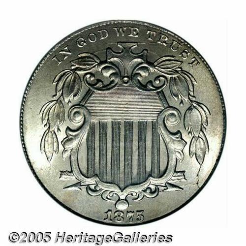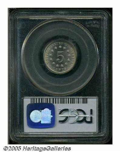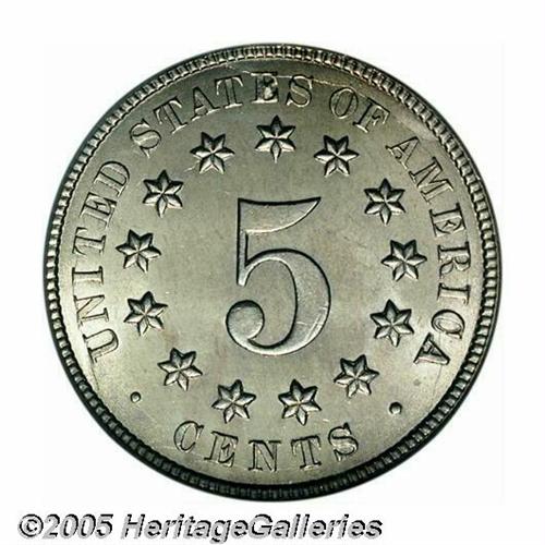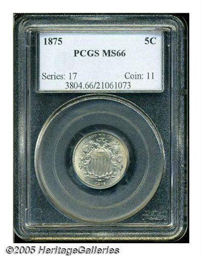 <B>1875<5C> MS66 PCGS.</B></I> This issue has a respectable original mintage of 2 million coins, but it is not at all common in Mint State. After the 1880 and 1879, the 1875 is the rarest Shield Nickel in Uncirculated grades (per Peters and Mohon, 1995). The present Gem is one of the finest examples extant. The surfaces lack the striking incompleteness and planchet flaws that typically plague survivors of this date. There are, however, numerous fascinating die cracks around the peripheries. In fact, it appears as though sizeable portions of both dies were ready to shear off when this coin was impressed. Otherwise, the surfaces are smooth with a hard, satiny sheen and sharp striking definition. Delicate pastel tinged undertones are evident at direct angles. Population: 9 in 66, 0 finer (4/05).<BR><I>From The Western Hills Collection.</B></I>