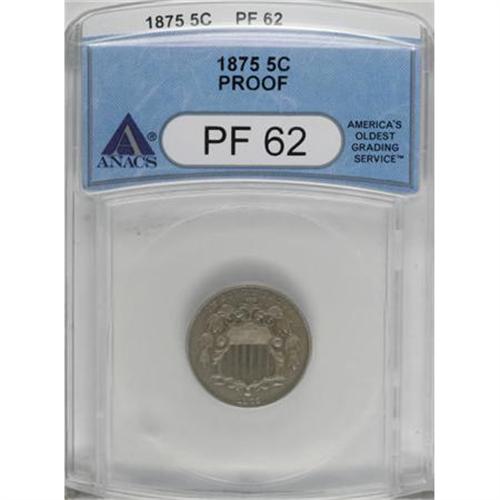 <B>1875 5C PR62 ANACS.</B></I> NGC Census: (8/207). PCGS Population (14/250). Mintage: 700. Numismedia Wsl. Price for NGC/PCGS coin in PR62: $260. (#3829)<BR><BR><B>Coin Engraver:</B> James B. Longacre<BR><BR><b>Shipping:</b> Coins & Currency (<a target="_blank" href="http://www.heritageauctions.com/common/shipping.php">view shipping information</a>)