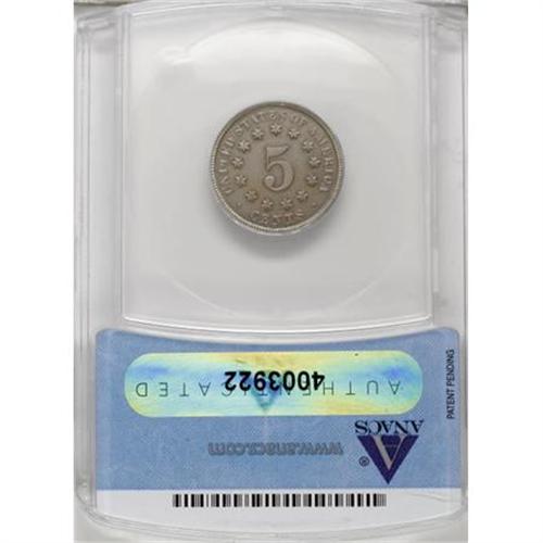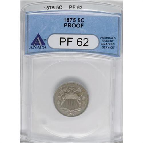 <B>1875 5C PR62 ANACS.</B></I> NGC Census: (8/207). PCGS Population (14/250). Mintage: 700. Numismedia Wsl. Price for NGC/PCGS coin in PR62: $260. (#3829)<BR><BR><B>Coin Engraver:</B> James B. Longacre<BR><BR><b>Shipping:</b> Coins & Currency (<a target="_blank" href="http://www.heritageauctions.com/common/shipping.php">view shipping information</a>)