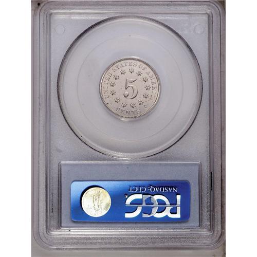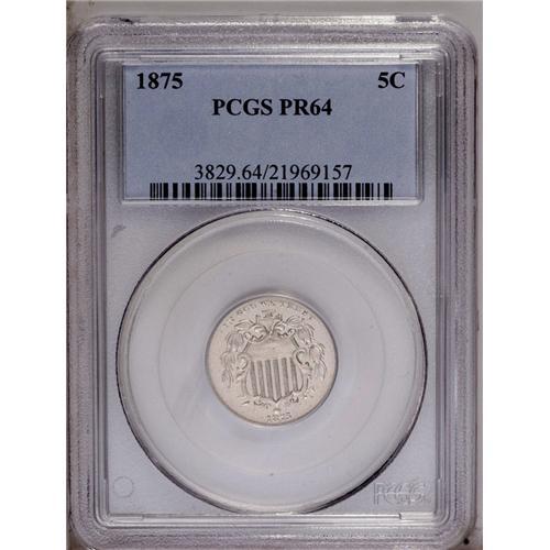 <B>1875<5C> PR64 PCGS.</B></I> Brightly mirrored with a few wispy hairlines on the reverse intermixed with countless die striations. A few freckles of reverse toning are noticed upon close inspection. <BR><BR><B>Important notice:</B> Heritage usually auctions material at the rate of 200-250 lots per hour. On some occasions eBay Live bid software or the Internet may not be able to keep up with the pace of the auction. We recommend placing a realistic absentee bid now as insurance to avoid disappointment. Occasionally the auctioneer may eliminate or reject an eBay Live bid, and the auctioneer may also reopen a lot after the close of the eBay live bidding (usually because we missed an audience bid), and may reject your bid even if it shows you as the winning bidder. By bidding via eBay Live, you agree that Heritage may award the lot to another bidder at its sole discretion under the circumstances described above or any other reasonable circumstances. Since eBay bids are not shown to us until we open the lot on the floor, we treat those bids just like floor bids. In most cases the floor responds before the eBay bid is presented to us, due to Internet lag time, so for consistency we have made it a policy that floor bids are always considered first over tie eBay live bids. Also please note that all Heritage lots purchased through eBay Live carry a 20% Buyer's Premium. Please make sure you read the Terms and Conditions before you bid. This lot is being auctioned in conjunction with a live floor auction by Heritage Galleries & Auctioneers. All final auction and invoice information will be supplied by Heritage Galleries & Auctioneers, and all other information should be considered preliminary. Lot:887 <BR><BR><B>Winning Notification and Billing:</B> After the FINAL session in this auction is complete, Heritage will send e-mail and snail mail invoices. This process normally takes several days. All final auction and invoice information will be supplied by Heritage Galleries & Auctioneers, and all other information should be considered preliminary. <BR><BR>This auction will be conducted on a live auction floor and over the Internet through eBay Live. If you choose to place an absentee bid, please take a moment to <font color='#0000ff'><u><a href='http://pages.ebay.com/liveauctions/help/before/laabsentee.html'>learn how eBay Live absentee bidding works</a></u></font><font color='#000000'>
