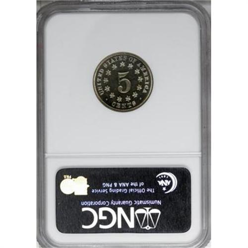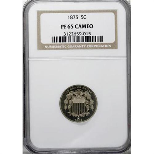 <B>1875 5C PR65 Cameo NGC.</B></I> Watery mirrors and delicately frosted devices combine for undeniable contrast on each side. Untoned save for whispers of golden-tan near the rims and eminently appealing. Census: 15 in 65 Cameo, 11 finer (1/08).<BR><I>From The John Stimson, Sr. Collection, Part Two.</B></I><BR><BR><b>Shipping:</b> Coins & Currency (<a target="_blank" href="http://www.heritageauctions.com/common/shipping.php">view shipping information</a>)