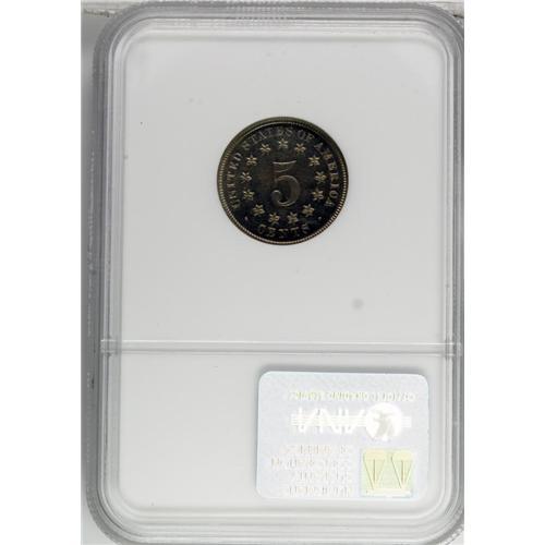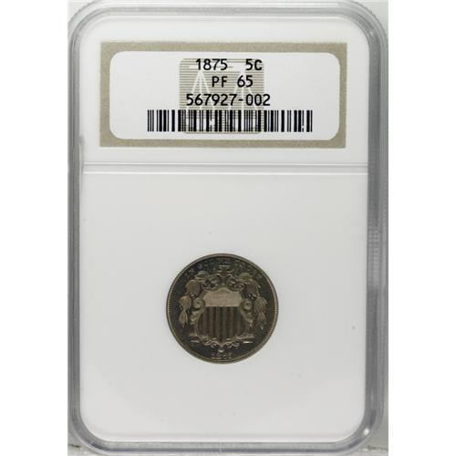 <B>1875 5C PR65 NGC.</B></I> An attractive Gem proof with evident cameo contrast beneath a veil of champagne toning.<BR><BR><b>Shipping:</b> Coin/Currency (<a target="_blank" href="http://www.heritageauctions.com/common/shipping.php">view shipping information</a>)