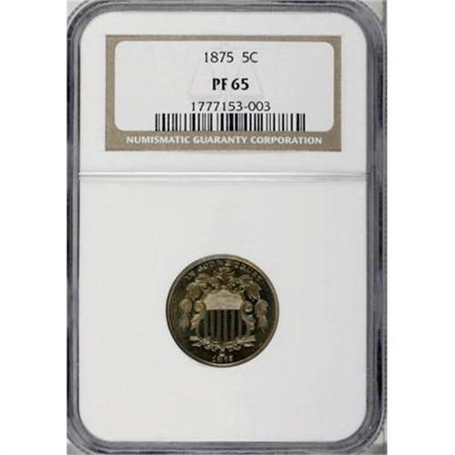 <B>1875 5C PR65 NGC.</B></I> Vibrant champagne and canary-gold shadings characterize the obverse, while the reverse displays more muted mustard-yellow patina. Crisply struck and impressively preserved, a delightful Gem. Census: 58 in 65, 22 finer (3/08).<BR><BR><B>Coin Engraver:</B> James B. Longacre<BR><BR><b>Shipping:</b> Coins & Currency (<a target="_blank" href="http://www.heritageauctions.com/common/shipping.php">view shipping information</a>)