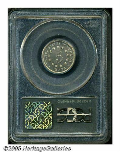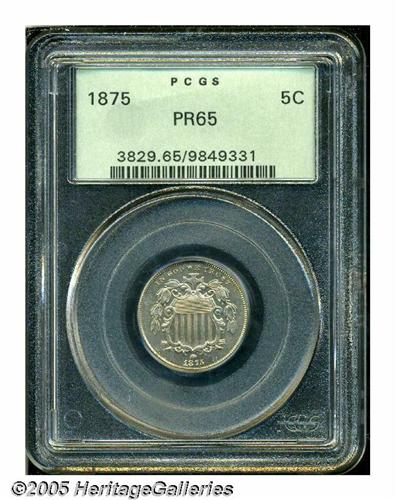<B>1875<5C> PR65 PCGS.</B></I> Lightly toned with blushes of pale yellow-gold and green patina. The strike is good. The obverse exhibits minor planchet flaking (as struck) around the date, and the reverse has a few miniscule planchet flaws (as produced), but no post-striking defects seem evident on either side. A scarce proof issue.