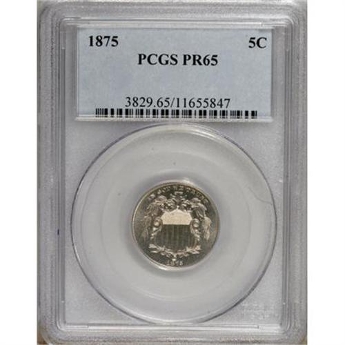 <B>1875 5C PR65 PCGS.</B></I> Well struck with a pleasingly reflective appearance. An attractive, essentially untoned specimen with clean surfaces and great eye appeal. Population: 56 in 65, 9 finer (4/07). <BR><BR><b>Shipping:</b> Coins & Currency (<a target="_blank" href="http://www.heritageauctions.com/common/shipping.php">view shipping information</a>)
