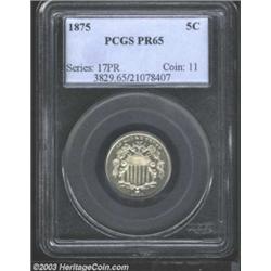 <TABLE cellSpacing=0 cellPadding=0 width="100%" bgColor=#000000 border=0><TBODY><TR><TD width="100%"><TABLE cellSpacing=1 cellPadding=3 width="100%" border=0><TBODY><TR><TD width="100%" bgColor=#79735c><FONT face=arial color=#ffffff size=3><B>Description</B> </FONT></TD></TR><TR><TD width="100%" bgColor=#ffffff><FONT face=arial size=2><B>1875 5C PR65 PCGS.</B></I> A lightly toned and well struck Gem. Although the traditional mintage of 700 pieces is now considered suspect, this issue is scarce enough that a mintage below 1,000 pieces is probable. Population: 61 in 65, 11 finer (4/03). </FONT></TD></TR></TBODY></TABLE></TD></TR></TBODY></TABLE><BR><A name=PricesRealized></A><TABLE cellSpacing=0 cellPadding=0 width="100%" bgColor=#000000 border=0><TBODY><TR><TD width="100%"><TABLE cellSpacing=1 cellPadding=3 width="100%" border=0><TBODY><TR><TD width="100%" bgColor=#79735c><A name=PR><FONT face=arial color=#ffffff size=3><B>Previous Prices from Heritage Auctions</B> </FONT></A></TD></TR><TR><TD bgColor=#f6f6ed><TABLE cellSpacing=0 cellPadding=0 width="100%" border=1><TBODY><TR><TD align=middle width="33%"><B>Date</B></TD><TD align=middle width="33%"><B>Service</B></TD><TD align=middle width="33%"><B>Price</B></TD></TR><TR bgColor=whitesmoke><TD width="33%"><B>01/11/2003</B></TD><TD width="33%">PCGS</TD><TD width="33%">$1,380.00</TD></TR><TR bgColor=whitesmoke><TD width="33%"><B>10/06/2001</B></TD><TD width="33%">NGC</TD><TD width="33%">$920.00</TD></TR><TR bgColor=whitesmoke><TD width="33%"><B>01/11/2003</B></TD><TD width="33%">PCGS</TD><TD width="33%">$1,265.00</TD></TR><TR bgColor=whitesmoke><TD width="33%"><B>02/01/2001</B></TD><TD width="33%">PCGS</TD><TD width="33%">$1,610.00</TD></TR><TR bgColor=whitesmoke><TD width="33%"><B>06/10/2002</B></TD><TD width="33%">PCGS</TD><TD width="33%">$552.00</TD></TR><TR bgColor=whitesmoke><TD width="33%"><B>01/13/2002</B></TD><TD width="33%">PCGS</TD><TD width="33%">$1,437.50</TD></TR><TR bgColor=whitesmoke><TD width="33%"><B>04/23/1999</B></TD><TD width="33%">PCGS</TD><TD width="33%">$1,351.25</TD></TR><TR bgColor=whitesmoke><TD width="33%"><B>10/04/2000</B></TD><TD width="33%">PCGS</TD><TD width="33%">$1,495.00</TD></TR><TR bgColor=whitesmoke><TD width="33%"><B>03/01/1997</B></TD><TD width="33%">PCGS</TD><TD width="33%">$1,540.00</TD></TR><TR bgColor=whitesmoke><TD width="33%"><B>08/07/1998</B></TD><TD width="33%">NGC</TD><TD width="33%">$1,207.50</TD></TR><TR bgColor=whitesmoke><TD width="33%"><B>09/25/1999</B></TD><TD width="33%">NGC</TD><TD width="33%">$1,322.50</TD></TR><TR bgColor=whitesmoke><TD width="33%"><B>04/05/2001</B></TD><TD width="33%">PCGS</TD><TD width="33%">$1,495.00</TD></TR><TR bgColor=whitesmoke><TD width="33%"><B>11/17/2000</B></TD><TD width="33%">PCGS</TD><TD width="33%">$1,265.00</TD></TR><TR bgColor=whitesmoke><TD width="33%"><B>07/30/1994</B></TD><TD width="33%">PCGS</TD><TD width="33%">$1,265.00</TD></TR><TR bgColor=whitesmoke><TD width="33%"><B>06/01/2000</B></TD><TD width="33%">NGC</TD><TD width="33%">$1,432.00</TD></TR></TBODY></TABLE></TD></TR><TR><TD bgColor=#ffffff><FONT face=arial size=1 ?>PLEASE NOTE: All prices realized reflect the final hammer price PLUS the buyer's premium in auctions that charge a buyer's premium. Each item has a notation at the top of the listing indicating whether that lot included a buyer's premium. Example: A item that sells with a final hammer price of $100 and a 20% buyer's premium will display with a price realized of $120. All information listed is intended to be as accurate as possible, but errors are possible. Please use this guide carefully and inform us of any inaccuracies. </FONT></TD></TR></TBODY></TABLE></TD></TR></TBODY></TABLE><BR><TABLE cellSpacing=0 cellPadding=0 width="100%" bgColor=#000000 border=0><TBODY><TR><TD width="100%"><TABLE cellSpacing=1 cellPadding=3 width="100%" border=0><TBODY><TR><TD width="100%" bgColor=#79735c colSpan=6><FONT face=arial color=#ffffff size=3><B>Price Guide*</B> </FONT></TD></TR><TR bgColor=#f6f6ed><TD align=middle><B>Grade</B> </TD><TD align=middle><B>Coin World<BR>(Trends)</B> </TD><TD align=middle><B>Numismedia<BR>Retail</B> </TD><TD align=middle><B>Numismedia<BR>Wholesale</B> </TD><TD align=middle><B>Coin<BR>Universe</B> </TD><TD align=middle><B>Heritage<BR>Value Index</B> </TD></TR><TR bgColor=#ffffff><TD align=middle>64</TD><TD align=right>---</TD><TD align=right>$550.00</TD><TD align=right>$440.00</TD><TD align=right>$450.00</TD><TD align=right>$337.50</TD></TR><TR style="FONT-WEIGHT: bold" bgColor=#cccfdd><TD align=middle>65</TD><TD align=right>---</TD><TD align=right>---</TD><TD align=right>$1,250.00</TD><TD align=right>$1,900.00</TD><TD align=right>$1,246.67</TD></TR><TR bgColor=#ffffff><TD align=middle>66</TD><TD align=right>---</TD><TD align=right>---</TD><TD align=right>$2,250.00</TD><TD align=right>$3,000.00</TD><TD align=right>$1,800.00</TD></TR><TR bgColor=#ffffff><TD colSpan=6><FONT size=1>*All information listed is intended to be as accurate as possible, but errors are possible. No item may be returned or refused based on this information which is provided as a service to our customers. You should contact each pricing source directly to determine the accuracy of this information. </FONT></TD></TR></TBODY></TABLE></TD></TR></TBODY></TABLE><BR><TABLE cellSpacing=0 cellPadding=0 width="100%" bgColor=#000000 border=0><TBODY><TR><TD width="100%"><TABLE cellSpacing=1 cellPadding=3 width="100%" border=0><TBODY><TR><TD width="100%" bgColor=#79735c><FONT face=arial color=#ffffff size=3><B>Population Guide</B> </FONT></TD></TR><TR bgColor=#ffffff><TD align=middle><!-- Begin Output of Population Grid--><TABLE cellSpacing=0 cellPadding=0 width="100%" border=0><TBODY><TR><TD vAlign=center><TABLE cellSpacing=0 width="100%" border=1 cellsadding="3"><TBODY><TR><TD vAlign=center><TABLE cellSpacing=0 cellPadding=3 width="100%" border=1><TBODY><TR><TD vAlign=center align=middle bgColor=#f0f1e8 colSpan=2 <CENTER><FONT face=Arial size=2><B>PCGS P