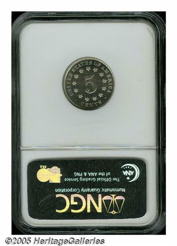 <B>1875<5C> PR66 NGC.</B></I> This brilliant proof is one of 700 or so minted. The design elements are exquisitely well struck, and there are no mentionable marks to report. NGC and PCGS combined have certified 29 pieces at this grade level, and only one higher (4/05).