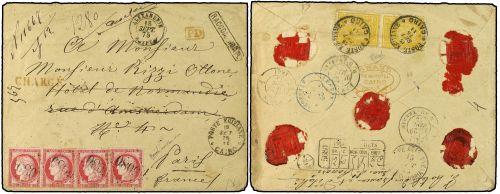 1875 CAIRO a PARIS. Carta certificada con franqueo al dorso de dos sellos de Egipto de 2 pi. amarillo para el pago del porte interno y cuatro sellos franceses de 80 cts. carmín para el pago del porte exterior desde la Agencia Francesa en Alexandria. Excepcional franqueo mixto.