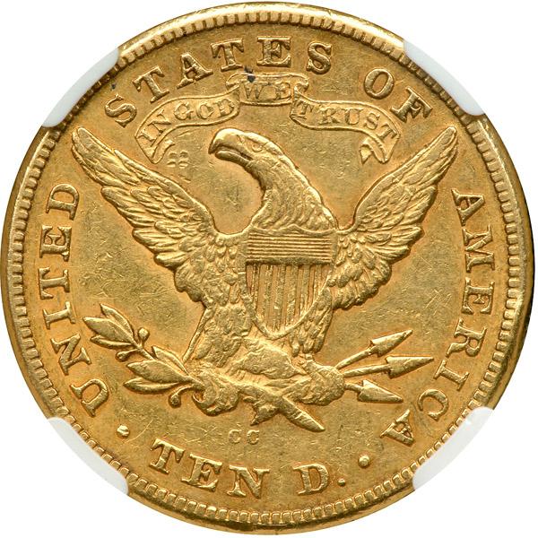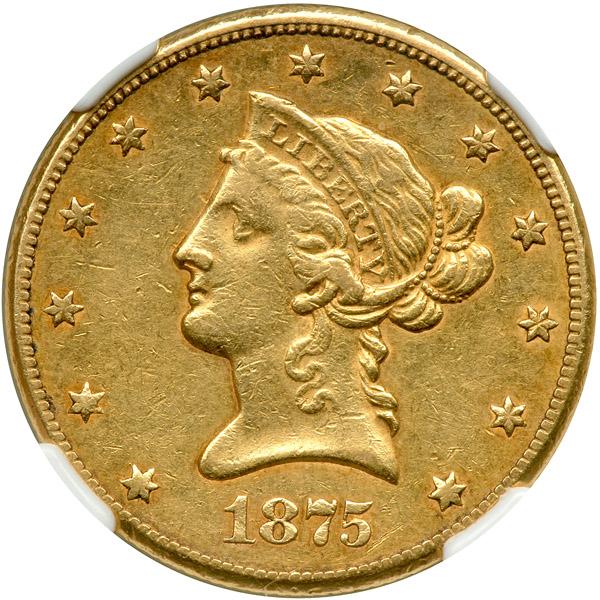 1875-CC $10 Liberty. NGC graded AU-50. Only 7,715 pieces struck. This high quality 1875-CC is in the highest grade class (AU) according to the NGC report and is high Condition Census with regard to the year and mint. Pleasing reddish to warm gold with a trace of luster brightness in the areas protected fromo wear. From a modest mintage for the date of 7,715 pieces, it seems with most 1875-CC survivors from that mintage, the usual grade hovers around VF or so. The Winter-Cutler reference calls this date "one of the rarest Carson City eagles from the standpoint of pieces known and rarity."