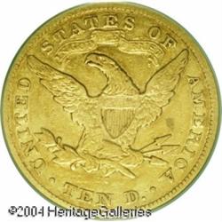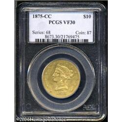 1875-CC $10 VF30 PCGS. While the 1875-CC is one of <B>1875-CC $10 VF30 PCGS.</B></I> While the 1875-CC is one of the more elusive gold coins from this historic Western mint, it is also one of the softest struck. Unfortunately, this coin does not break that generalization as the obverse (especially) is weakly defined and shows significantly less detailing than the reverse. Slight bits of original mint luster still can be seen around the devices. Lightly abraded with a slight reddish cast. <BR><BR><B>Important notice:</B> Heritage usually auctions material at the rate of 200-250 lots per hour. On some occasions eBay Live bid software or the Internet may not be able to keep up with the pace of the auction. We recommend placing a realistic absentee bid now as insurance to avoid disappointment. Occasionally the auctioneer may eliminate or reject an eBay Live bid, and the auctioneer may also reopen a lot after the close of the eBay live bidding (usually because we missed an audience bid), and may reject your bid even if it shows you as the winning bidder. By bidding via eBay Live, you agree that Heritage may award the lot to another bidder at its sole discretion under the circumstances described above or any other reasonable circumstances. Since eBay bids are not shown to us until we open the lot on the floor, we treat those bids just like floor bids. In most cases the floor responds before the eBay bid is presented to us, due to Internet lag time, so for consistency we have made it a policy that floor bids are always considered first over tie eBay live bids. Also please note that all Heritage lots purchased through eBay Live carry a 20% Buyer's Premium. Please make sure you read the Terms and Conditions before you bid. This lot is being auctioned in conjunction with a live floor auction by Heritage Galleries & Auctioneers. All final auction and invoice information will be supplied by Heritage Galleries & Auctioneers, and all other information should be considered preliminary. Lot:6748