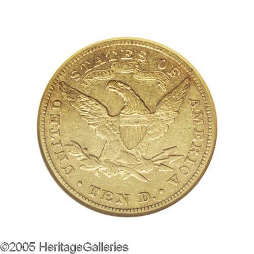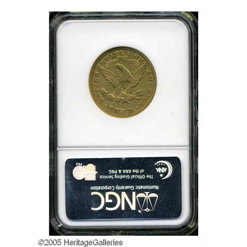 <B>1875-CC<$10> XF45 NGC.</B></I> Except for the 1874-CC, Carson City Eagles from the first decade of the legendary mint's production are seldom encountered. The 1875-CC is a typical entry with a miniscule production of 7,715 pieces, all of which went into circulation and generally stayed there. The pale golden-brown surfaces are only lightly bagmarked on the present example, which has sharp details on the eagle's wings and somewhat lesser definition on Liberty's curls. Census: 6 in 45, 14 finer (11/05).