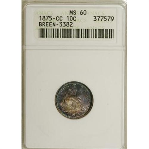 <B>1875-CC 10C Mintmark Above Bow MS60 ANACS.</B></I> Breen-3382. NGC Census: (0/206). PCGS Population (1/142). Mintage: 4,645,000. Numismedia Wsl. Price for NGC/PCGS coin in MS60: $185. (#4673)<BR><BR><B>Coin Engraver:</B> Christian Gobrecht<BR><BR><b>Shipping:</b> Coins & Currency (<a target="_blank" href="http://www.heritageauctions.com/common/shipping.php">view shipping information</a>)