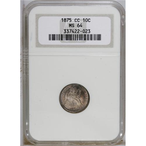 1875-CC 10C Mintmark Above Bow MS64 NGC. Heavy violet-