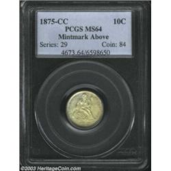 <TR><TD width="100%"><TABLE cellSpacing=1 cellPadding=3 width="100%" border=0><TBODY><TR><TD width="100%" bgColor=#79735c><FONT face=arial color=#ffffff size=3><B>Description</B> </FONT></TD></TR><TR><TD width="100%" bgColor=#ffffff><FONT face=arial size=2><B>1875-CC 10C Mintmark Above Bow MS64 PCGS.</B></I> Both sides have a moderate coating of medium gray patina. Sharply struck with modest luster and a few faint handling marks in the obverse field. The mintmark is widely spaced, and the first C is noticeably lower in the field than is the second C. The reverse has several wispy die cracks, as struck.<BR><I>From the Brian Loncar Collection.</B></I> </FONT></TD></TR></TBODY></TABLE></TD></TR></TBODY></TABLE><BR><A name=PricesRealized></A><TABLE cellSpacing=0 cellPadding=0 width="100%" bgColor=#000000 border=0><TBODY><TR><TD width="100%"><TABLE cellSpacing=1 cellPadding=3 width="100%" border=0><TBODY><TR><TD width="100%" bgColor=#79735c><A name=PR><FONT face=arial color=#ffffff size=3><B>Previous Prices from Heritage Auctions</B> </FONT></A></TD></TR><TR><TD bgColor=#f6f6ed><TABLE cellSpacing=0 cellPadding=0 width="100%" border=1><TBODY><TR><TD align=middle width="33%"><B>Date</B></TD><TD align=middle width="33%"><B>Service</B></TD><TD align=middle width="33%"><B>Price</B></TD></TR><TR bgColor=whitesmoke><TD width="33%"><B>04/08/1994</B></TD><TD width="33%">PCGS</TD><TD width="33%">$522.50</TD></TR><TR bgColor=whitesmoke><TD width="33%"><B>02/11/2003</B></TD><TD width="33%">PCGS</TD><TD width="33%">$483.00</TD></TR><TR bgColor=whitesmoke><TD width="33%"><B>09/21/1996</B></TD><TD width="33%">NGC</TD><TD width="33%">$374.00</TD></TR></TBODY></TABLE></TD></TR><TR><TD bgColor=#ffffff><FONT face=arial size=1 ?>PLEASE NOTE: All prices realized reflect the final hammer price PLUS the buyer's premium in auctions that charge a buyer's premium. Each item has a notation at the top of the listing indicating whether that lot included a buyer's premium. Example: A item that sells with a final hammer price of $100 and a 20% buyer's premium will display with a price realized of $120. All information listed is intended to be as accurate as possible, but errors are possible. Please use this guide carefully and inform us of any inaccuracies. </FONT></TD></TR></TBODY></TABLE></TD></TR></TBODY></TABLE><BR><TABLE cellSpacing=0 cellPadding=0 width="100%" bgColor=#000000 border=0><TBODY><TR><TD width="100%"><TABLE cellSpacing=1 cellPadding=3 width="100%" border=0><TBODY><TR><TD width="100%" bgColor=#79735c colSpan=6><FONT face=arial color=#ffffff size=3><B>Price Guide*</B> </FONT></TD></TR><TR bgColor=#f6f6ed><TD align=middle><B>Grade</B> </TD><TD align=middle><B>Coin World<BR>(Trends)</B> </TD><TD align=middle><B>Numismedia<BR>Retail</B> </TD><TD align=middle><B>Numismedia<BR>Wholesale</B> </TD><TD align=middle><B>Coin<BR>Universe</B> </TD><TD align=middle><B>Heritage<BR>Value Index</B> </TD></TR><TR bgColor=#ffffff><TD align=middle>63</TD><TD align=right>$360.00</TD><TD align=right>$258.00</TD><TD align=right>$215.00</TD><TD align=right>$340.00</TD><TD align=right>$242.83</TD></TR><TR style="FONT-WEIGHT: bold" bgColor=#cccfdd><TD align=middle>64</TD><TD align=right>$675.00</TD><TD align=right>$730.00</TD><TD align=right>$585.00</TD><TD align=right>$585.00</TD><TD align=right>$438.00</TD></TR><TR bgColor=#ffffff><TD align=middle>65</TD><TD align=right>---</TD><TD align=right>---</TD><TD align=right>$1,250.00</TD><TD align=right>$1,375.00</TD><TD align=right>$1,142.50</TD></TR><TR bgColor=#ffffff><TD colSpan=6><FONT size=1>*All information listed is intended to be as accurate as possible, but errors are possible. No item may be returned or refused based on this information which is provided as a service to our customers. You should contact each pricing source directly to determine the accuracy of this information. </FONT></TD></TR></TBODY></TABLE></TD></TR></TBODY></TABLE><BR><TABLE cellSpacing=0 cellPadding=0 width="100%" bgColor=#000000 border=0><TBODY><TR><TD width="100%"><TABLE cellSpacing=1 cellPadding=3 width="100%" border=0><TBODY><TR><TD width="100%" bgColor=#79735c><FONT face=arial color=#ffffff size=3><B>Population Guide</B> </FONT></TD></TR><TR bgColor=#ffffff><TD align=middle><!-- Begin Output of Population Grid--><TABLE cellSpacing=0 cellPadding=0 width="100%" border=0><TBODY><TR><TD vAlign=center><TABLE cellSpacing=0 width="100%" border=1 cellsadding="3"><TBODY><TR><TD vAlign=center><TABLE cellSpacing=0 cellPadding=3 width="100%" border=1><TBODY><TR><TD vAlign=center align=middle bgColor=#f0f1e8 colSpan=2 <CENTER><FONT face=Arial size=2><B>PCGS Pop </B></FONT><CENTER></CENTER></TD><TD vAlign=center align=middle bgColor=#f0f1e8 colSpan=2><CENTER><FONT face=Arial size=2><B>NGC Pop</B></CENTER></FONT></TD></TR><TR><TD vAlign=center><FONT face=Arial size=2>(64)</FONT> </TD><TD vAlign=center align=right><FONT face=Arial size=2>34</FONT> </TD><TD vAlign=center><FONT face=Arial size=2>(64)</FONT> </TD><TD vAlign=center align=right><FONT face=Arial size=2>48</FONT> </TD></TR><TR><TD vAlign=center><FONT face=Arial size=2>(>64)</FONT> </TD><TD vAlign=center align=right><FONT face=Arial size=2>26</FONT> </TD><TD vAlign=center><FONT face=Arial size=2>(>64)</FONT> </TD><TD vAlign=center align=right><FONT face=Arial size=2>48</FONT> </TD></TR></TBODY></TABLE></TD></TR></TBODY></TABLE></TD></TR></TBODY></TABLE><!-- End Output of Population Grid--></TD></TR></TBODY></TABLE></TD></TR></TBODY></TABLE><BR><TABLE cellSpacing=0 cellPadding=0 width="100%" bgColor=#000000 border=0><TBODY><TR> Important notice: We expect to be auctioning lots at the rate of 200-250 per hour. On occasion eBay live bid software cannot keep up with the pace of the auctions where 4-5 lots per minute can hammer down, so we recommend that you place a realistic absentee bid now as insurance to avoid disappointment. Also please note that all Heritage/CAA lots purchased through eBay Live carry a 20% Buyer's Premium. Please make sure you read the T
