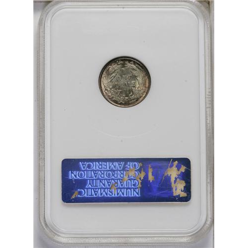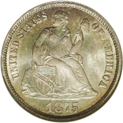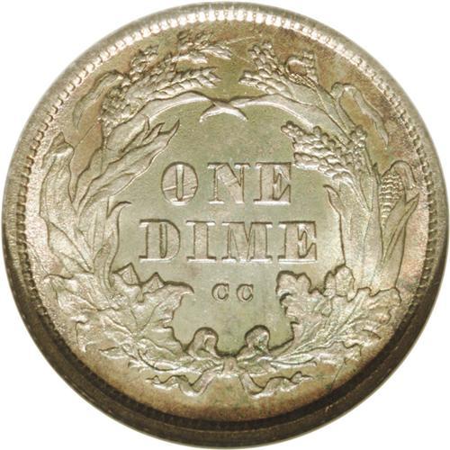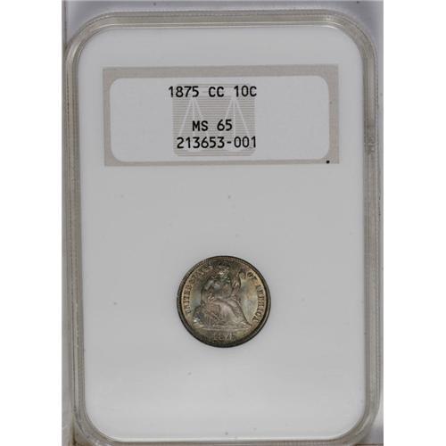 <B>1875-CC<10C> Mintmark Above Bow MS65 NGC.</B></I> Medium ocean-blue and salmon-pink toning endows this lustrous and intricately struck Gem. Only the ON in ONE exhibit any marks. The 1875-CC is the first readily available Carson City dime. The Mintmark Above Bow is valued slightly higher than its Below Bow counterpart, according to the 2007 <I>Guide Book.</B></I> Encapsulated in a prior generation holder.