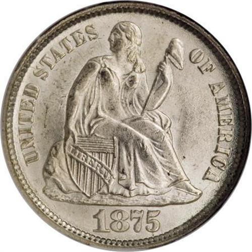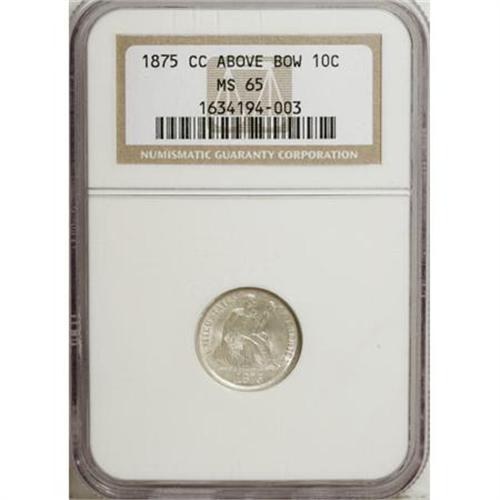 <B>1875-CC 10C Mintmark Above Bow MS65 NGC.</B></I> Satiny-white with ample mint frost over the design elements and a consistently strong strike. While among the most obtainable Carson City issues in Mint State, this fact actually works in its favor for the many collectors seeking a high quality example from the popular Western mint. Census: 35 in 65, 13 finer (7/07).<BR><BR><B>Coin Engraver:</B> Christian Gobrecht<BR><BR><b>Shipping:</b> Coins & Currency (<a target="_blank" href="http://www.heritageauctions.com/common/shipping.php">view shipping information</a>)