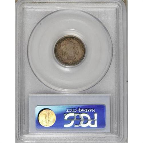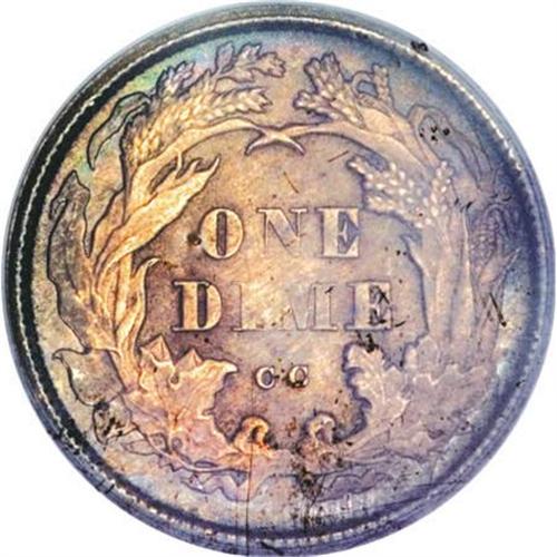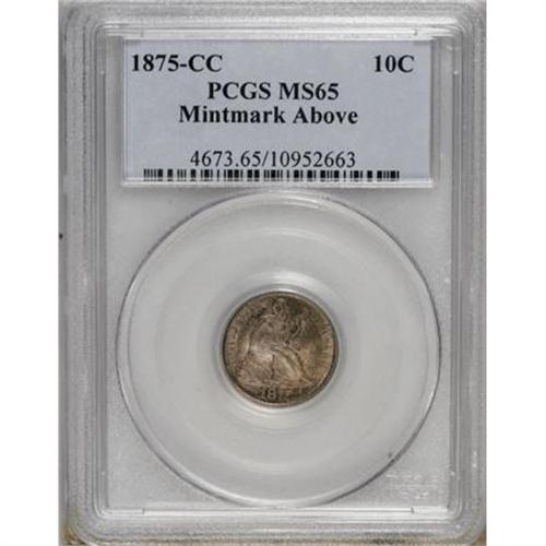 <B>1875-CC 10C Mintmark Above Bow MS65 PCGS.</B></I> Dusky tan-gray patination is deeper on the reverse, and is accented on both sides with whispers of aqua-green toward the borders. The obverse luster is strong, while the reverse is somewhat subdued by the depth of the toning. The design elements display an above-average strike, in that the head detail and upper portions of the wreath are better defined than usually seen. A couple of tiny marks beneath the F of OF identify the coin. Population: 18 in 65, 10 finer (12/07).<BR><BR><B>Coin Engraver:</B> Christian Gobrecht<BR><BR><b>Shipping:</b> Coins & Currency (<a target="_blank" href="http://www.heritageauctions.com/common/shipping.php">view shipping information</a>)