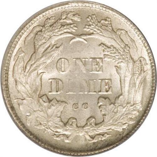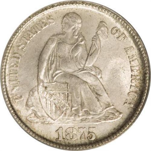 <B>1875-CC 10C Mintmark Above Bow MS65 PCGS.</B></I> The first high-mintage dime issued by the Carson City Mint, and an excellent choice for type collectors. This green-label Gem has brilliant silver surfaces with full mint frost on both sides. Specks of peripheral toning are evident on the obverse with deeper ivory reverse surfaces. A late die state, with several peripheral die cracks on the reverse. Population: 18 in 65, 10 finer (1/08).<BR><BR><B>Coin Engraver:</B> Christian Gobrecht<BR><BR><b>Shipping:</b> Coins & Currency (<a target="_blank" href="http://www.heritageauctions.com/common/shipping.php">view shipping information</a>)