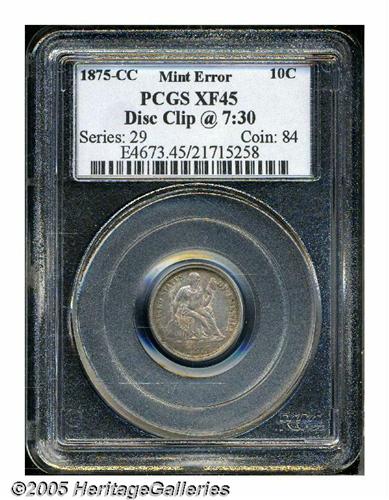 <B>1875-CC<10C> Mintmark Above Bow Seated Dime--Disc Clip at 7:30--XF45 PCGS.</B></I> Fortin-110. A small rim clip at 7:30 is not sufficient to cause a 'Blakesley effect' opposite. Medium dove-gray and golden-brown patina. Ample luster outlines the central legends and devices.<BR><I>From The Tim Cook Collection of Liberty Seated Dimes.</B></I>