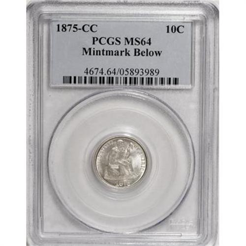 <B>1875-CC 10C Mintmark Below Bow MS64 PCGS.</B></I> Frosty with excellent detail for this Carson City minor silver issue. Whispers of silver-blue and peach visit slightly granular surfaces that are minimally toned otherwise. Population: 6 in 64, 8 finer (12/07).<BR><BR><B>Coin Engraver:</B> Christian Gobrecht<BR><BR><b>Shipping:</b> Coins & Currency (<a target="_blank" href="http://www.heritageauctions.com/common/shipping.php">view shipping information</a>)