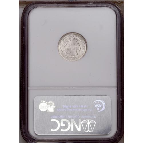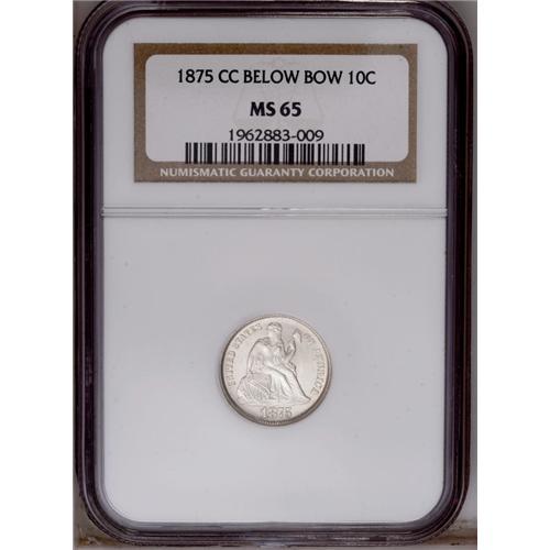 <B>1875-CC<10C> Mintmark Below Bow MS65 NGC.</B></I> This stellar specimen displays attractive silver-gray surfaces that possess a slight pebbly texture and glowing luster. The design elements exhibit nice definition, further enhancing the coin's eye appeal. Small marks on Liberty's right hand and in the left (facing) obverse field are mentioned for the sake of accuracy. Census: 8 in 65, 1 finer (3/06).