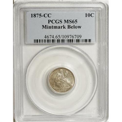<B>1875-CC 10C Mintmark Below Bow MS65 PCGS.</B></I> A frosty silver-gray that exhibits delicate tan accents on the obverse. The well-defined devices and luminous fields are equally clean. The Mintmark Below variant is slightly more elusive than the Mintmark Above. Population: 7 in 65, 1 finer (8/07).<B><BR></B></I><I>From The Beau Clerc Collection.</B></I><BR><BR><B>Coin Engraver:</B> Christian Gobrecht<BR><BR><b>Shipping:</b> Coins & Currency (<a target="_blank" href="http://www.heritageauctions.com/common/shipping.php">view shipping information</a>)