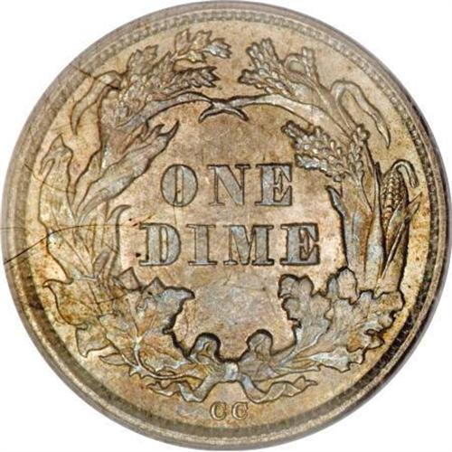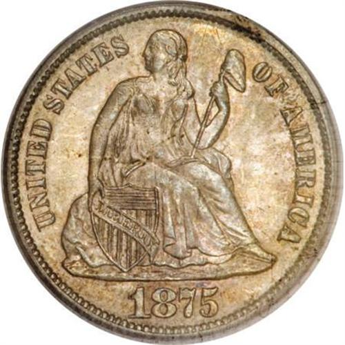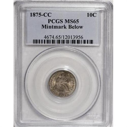 <B>1875-CC 10C Mintmark Below Bow MS65 PCGS.</B></I> The first of the common Carson City dime issues of the mid-1870s, the 1875-CC dime is divided into two obvious varieties, determined by the location of the mintmark. The Mintmark Below Bow variety is the scarcer of the two, and this coin is an outstanding example, bathed in heavy satin luster beneath variable antique silver color. The strike is sharp, with weakness seemingly being limited to the high points of the upper left wreath. Census: 7 in 65, 1 finer (12/07).<BR><BR><B>Coin Engraver:</B> Christian Gobrecht<BR><BR><b>Shipping:</b> Coins & Currency (<a target="_blank" href="http://www.heritageauctions.com/common/shipping.php">view shipping information</a>)