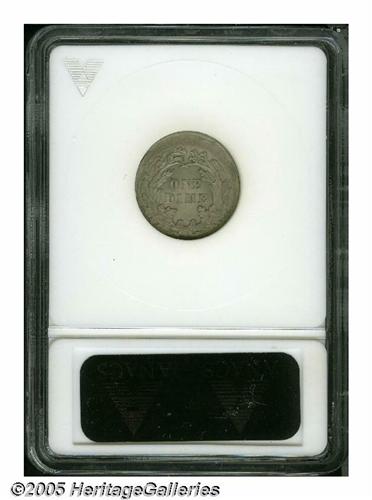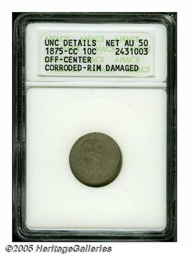 <B>1875-CC<10C> Mintmark Below Bow Seated Dime--Off Center, Corroded, Rim Damaged--ANACS. Unc Details, Net AU50.</B></I> Struck approximately 5% off center toward 12 o'clock, the mintmark and the top of Liberty's head approach the rim but are virtually intact.