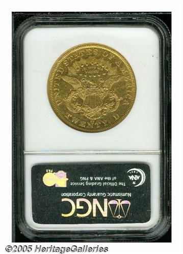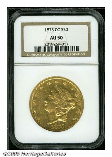<B>1875-CC<$20> AU50 NGC.</B></I> A strong strike with only a modest amount of wear. Quite frosty with nearly complete mint luster, interrupted only by minor obverse scuffiness. The 1875-CC serves double duty as a somewhat scarcer date in high grades, and as the most affordable Type Two double eagle from the Carson City Mint.