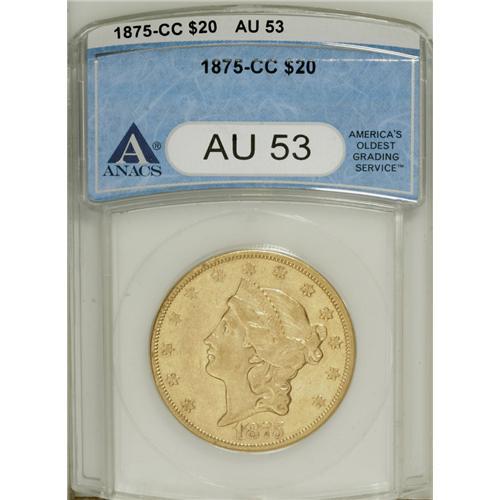 <B>1875-CC $20 AU53 ANACS.</B></I> Minor wear is largely restricted to the highpoints on the lustrous reverse, though this wear is distributed more evenly on the obverse. Well struck with light marks in the straw-gold fields.<BR><BR><b>Shipping:</b> Coin/Currency (<a target="_blank" href="http://www.heritageauctions.com/common/shipping.php">view shipping information</a>)