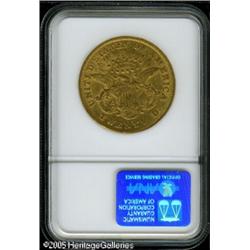 <B>1875-CC $20 AU53 NGC.</B></I> Bright canary-gold luster outlines the stars and connects the reverse peripheral legends. Nicely struck aside from the eagle's shield. The upper left obverse field has a few moderate marks. Lot:9100
