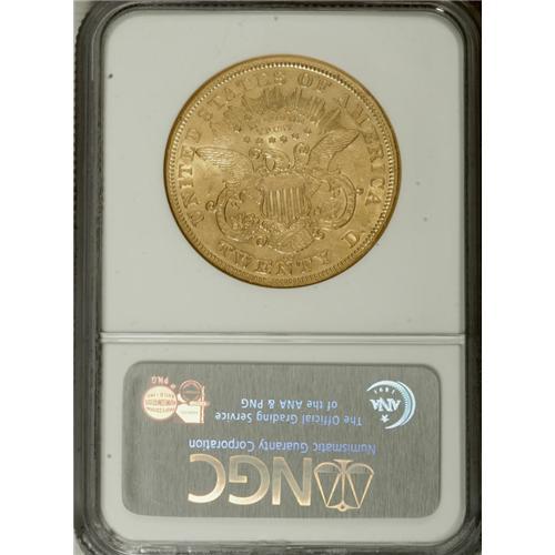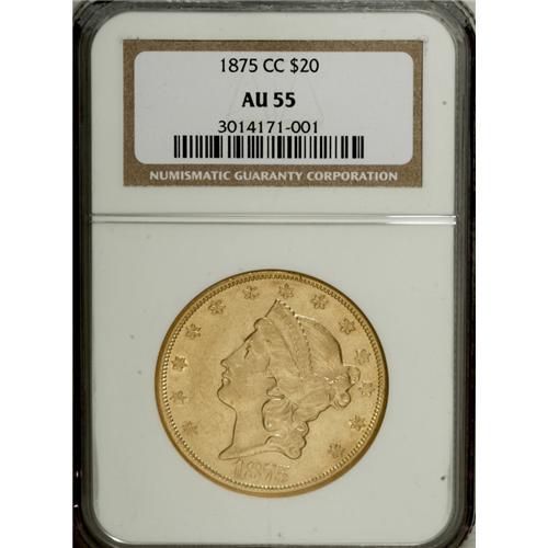 <B>1875-CC $20 AU55 NGC.</B></I> The intense luster seems nearly full, illuminating lovely straw-gold surfaces. Numerous small abrasions on each side and trace amounts of highpoint wear preclude a Mint State grade designation.<BR><BR><b>Shipping:</b> Coins & Currency (<a target="_blank" href="http://www.heritageauctions.com/common/shipping.php">view shipping information</a>)